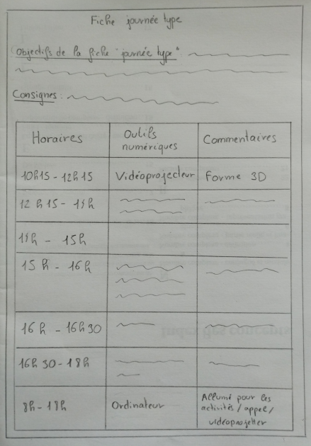 Pendant son cours de 10h15 à 12h15, Martine se rend compte qu’elle utilise le vidéoprojecteur afin d’expliquer les formes géométrique en 3D. Elle note alors très rapidement sur sa fiche « 10h15 - 12h45 | Vidéoprojecteur | Forme 3D ». Cela ne lui a pris que quelques secondes et n’a pas perturbé son cours. Elle réalise cela pour tous les outils utilisés durant sa journée.