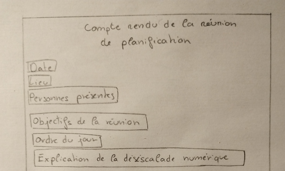 Jean Claude vient de rentrer chez lui. Il s'installe à son bureau et se lance dans la rédaction du compte rendu de la réunion. Il consulte la méthode "rédaction de compte rendu de la réunion de planification" disponible dans la boite a outils. Il ouvre un pad et commence la rédaction de son compte rendu. Il respecte la méthode et inscrit la date et le lieu de la réunion aussi que le nom des personnes présentes. Puis il saute une ligne et indique les objectifs de la réunion et l'ordre du jour. Il rédige un bref texte expliquant en quoi consiste la désescalade numérique et pourquoi il essai de la mettre en place dans son collège.