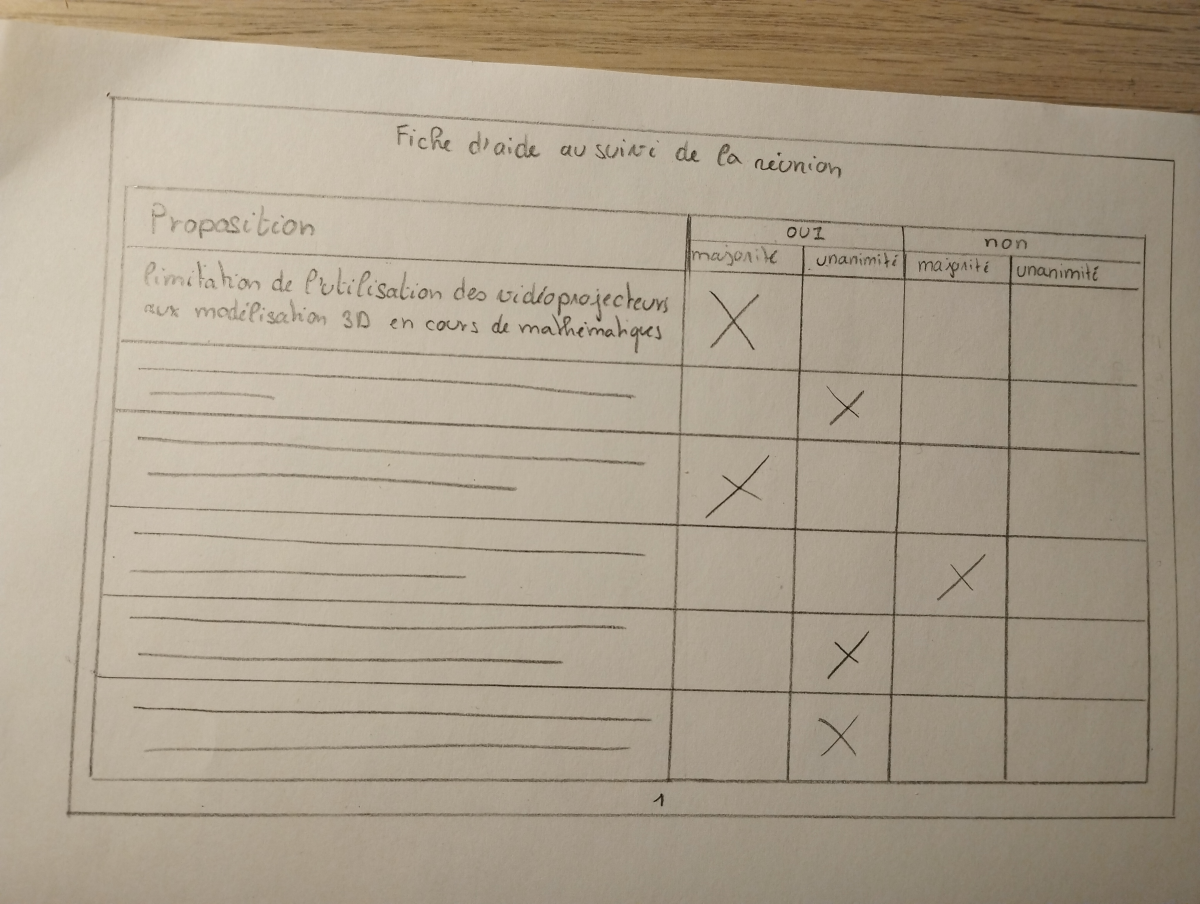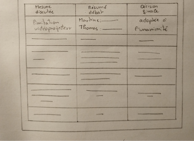 Jean Claude jette un coup d'œil à la méthode qui indique de tracer un tableau à trois colonnes et autant de lignes que de mesures discutées +1. Il complète la première colonne avec les trois propositions suivantes: mesure discutée, résumé du débat, décision finale .Puis il renseigne la première case dans laquelle il note "limitation de l'utilisation du vidéo projecteur à la projection de figures géométriques 3D en cours de mathématiques". Il complète la case "résumé du débat" et note dans la dernière case "adoptée à l'unanimité". Il recommence cette démarche pour toutes les autres mesures. Il termine le compte rendu en indiquant les coordonnées du collège, le numéro de téléphone de son bureau professionnel et son adresse mail professionnelle en invitant à le contacter en cas de questions concernant cette démarche de désescalade numérique.
