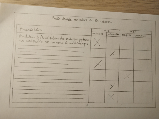 La première idée à débattre concerne l'utilisation du vidéoprojecteur en cours de mathématique. Suite au questionnaire de Martine ainsi qu'a sa fiche "journée type", la boite à outils propose de limiter l'utilisation du projecteur aux modélisation 3D des figures géométriques et donc d'arrêter de l'utiliser pour afficher le cours. Cette mesure implique le retour au tableau à feutres. Le débat commence et Martine s'exprime sur le fait qu'écrire au tableau ne lui pose pas de problèmes, de plus le tableau blanc est toujours en très bon état car il servait de support pour projeter le cours donc il n'y aura pas de frais supplémentaires à prendre en compte si ce n'est l'achat de feutres. Thomas, le délégué des élève intervient. Il déclare son assentiment pour cette idée mais rappelle quand même qu'une élève dans la classe est dyslexique et a besoin d'un support numérique pour pouvoir prendre le cours en note. Jean Claude précise que l'handicap de Louise avait déjà été pris en compte et qu'un polycopié adapté lui serait fourni afin qu'elle puisse suivre le cours sans difficultés. Le directeur demande si quelqu'un souhaite rajouter quelque chose sur le sujet. Personne ne se manifeste donc il procède au vote.