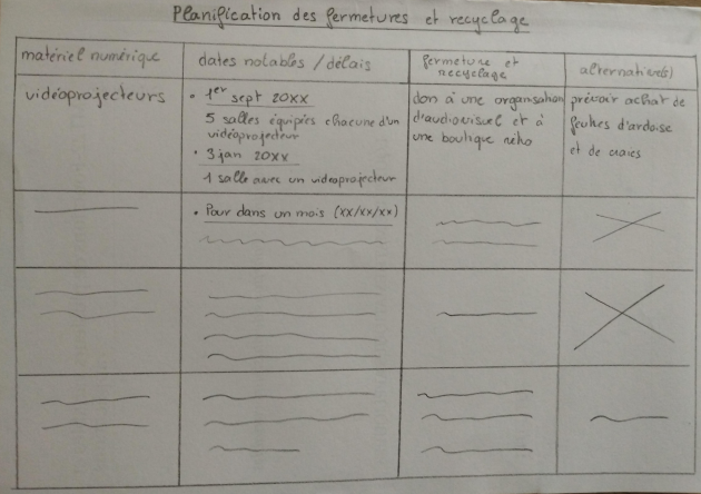 A la fin de la réunion ils vont tous ensemble organiser la planification de la désescalade numérique. Jean-Claude va citer chaque mesure retenue et pour chacune d’entre elle l’objectif va être de réfléchir à comment la mettre en place, les conséquences à anticiper sur le fonctionnement de l’établissement et à partir de quand l’adopter. Ils commencent à planifier l’enlèvement des vidéoprojecteurs. Martine suggère de ne pas tous les retirer directement parce qu’elle a besoin de réfléchir à comment modifier l’organisation de son cours afin de ne plus avoir à projeter ou de trouver des alternatives. C’est alors que Jean-Claude propose de laisser 5 salles avec un vidéoprojecteur mais l’objectif en fin d’année sera de tous les retirer. Martine fait une objection, elle n’est pas d’accord à ce qu’il n’y est plus du tout de vidéoprojecteur à la fin, on peut toujours en avoir besoin de le cadre pédagogique. Alors il est décidé d’en laisser un disponible dans une salle, pour les cas où le vidéoprojecteur est nécessaire. Ensuite, Claudia, la secrétaire, demande ce que vont devenir les vidéoprojecteurs actuelles, comment va se dérouler le recyclage. Charles propose alors de donner les vidéoprojecteurs à une organisation d’audiovisuel et à une boutique rétro afin que des particuliers les achètent. Jean-Claude demande si quelqu’un imagine la désescalade des vidéoprojecteurs autrement ou s’il y a des objections et conseils. Tout le monde est d’accord, les vidéoprojecteurs vont pouvoir être retiré dès la rentrée scolaire sauf dans 5 salles, l’organisation des cours ne va pas être perturbée. Ce déroule le même procédé pour chaque mesure. A la fin un planning est réalisé avec par exemple écrit : 1e septembre : vidéoprojecteur disponible dans 5 salles, 3 janvier : plus qu’un vidéoprojecteur.