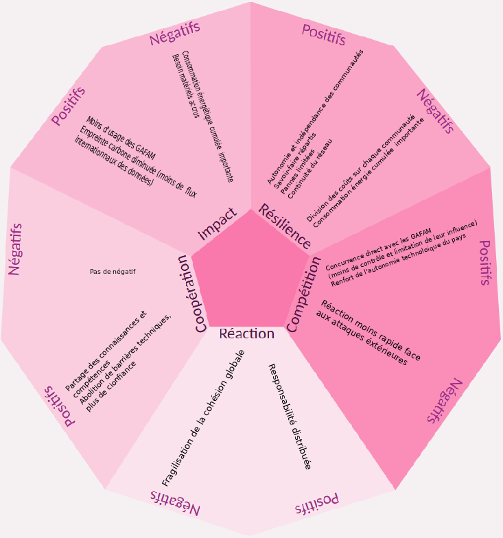 Effets de second ordre (à court terme) | Réduction de la dépendance aux GAFAM Réutilisation du code et mutualisation des outils libres Valorisation du temps d’attention | Fragmentation de la connaissance |