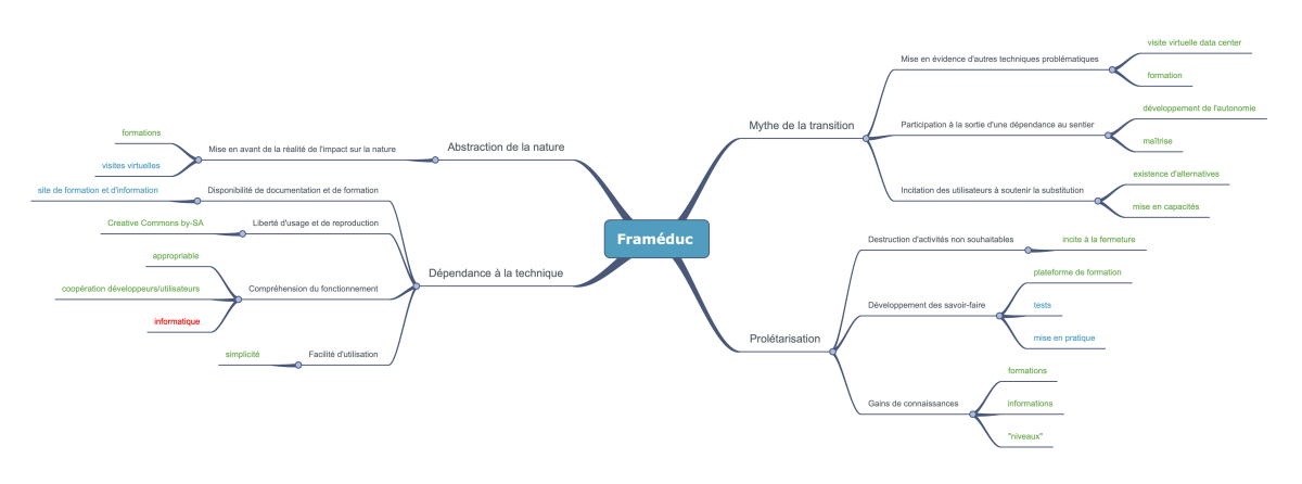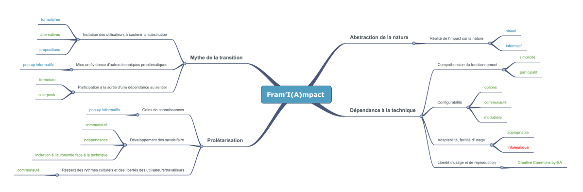 Des cartes mentales pour chacun de nos produit ont été réalisées dans le but de rendre les résultats de l’outil plus visuels. Les termes en verts impliquent une influence positive grâce au processus de lowtechisation ([+]), en bleus ils n’ont pas d’influence ([=]) et en rouge on sous-entend une influence négative ([-]).